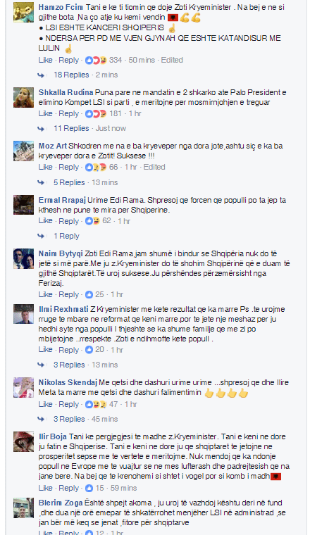 Pasi kryeministri Edi Rama e ka quajtur kryevepër të njerëzve të thjeshtë rezultatin e arritur deri në këtë fazë të numërimit për zgjedhjet në vend, qytetarët i janë “lëshuar” me një lumë komentesh. Pas postimit të hartës së vendit ngjyrosur me ngjyrën e Rilindjes, ndjekësit e tij në FB kanë vërshuar me mori komentesh duke i dhënë bashkë me urimet edhe një sërë porosish.