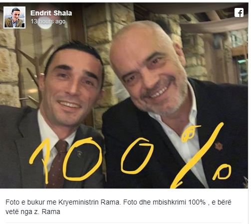 Mbi foto, shkruhet 100%. Dhe Shala shkruan: “Foto dhe mbishkrimi 100% , e bërë vetë nga z. Rama”.