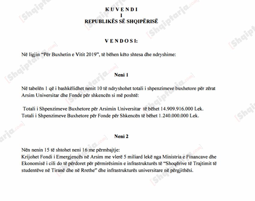 Qeveria ka dërguar në Kuvend një projektligj që parashikon ndryshimin e buxhetit të vitit 2019 për arsimin e lartë, ndërsa ka krijuar edhe një fond emergjencë 5 miliardë lekë për rikonstruksionin e konvikteve dhe pikat e tjera të studentëve. “Shqiptarja.com” shkruan se me ndryshimet e fundit që pritet që të miratohen në sesionin e ri parlamentar në Janar, fondet për arsimin e lartë bëhen 14 miliardë lekë, ndërsa ato për kërkimin shkencor 1,2 miliardë lekë duke u dyfishuar.