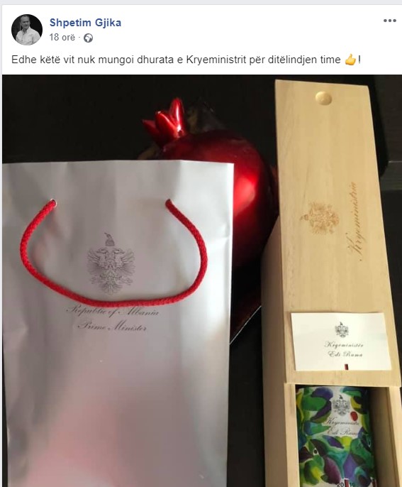 Këtë e ka bërë me dije vetë Gjika, me anë të një postimi në rrjetet sociale. Kreu i qeverisë i ka dhuruar atij një shishe verë, një dhuratë e kthyer në simbol kjo nga ana e kryeministrit.