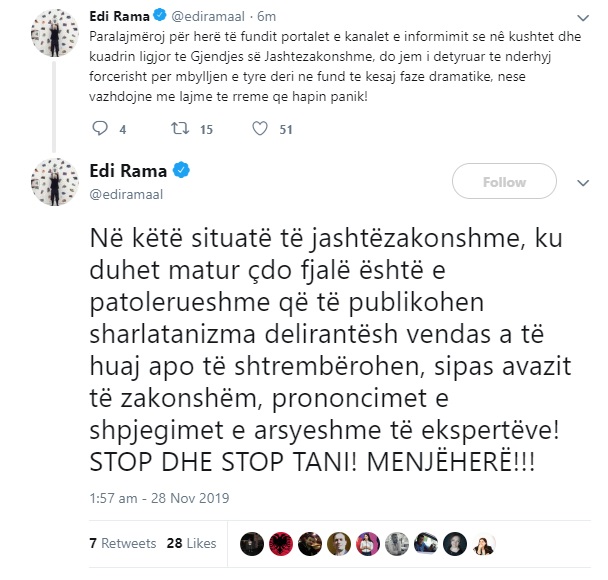 “Paralajmëroj për herë të fundit portalet e kanalet e informimit se nê kushtet dhe kuadrin ligjor te Gjendjes së Jashtezakonshme, do jem i detyruar te nderhyj forcerisht per mbylljen e tyre deri ne fund te kesaj faze dramatike, nese vazhdojne me lajme te rreme qe hapin panik!”, shkruan kryeministri Rama në “Twitter”.