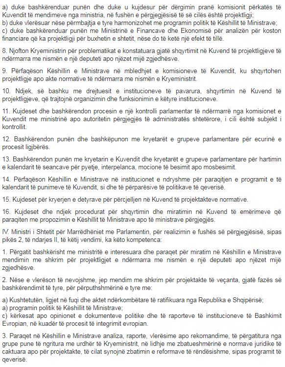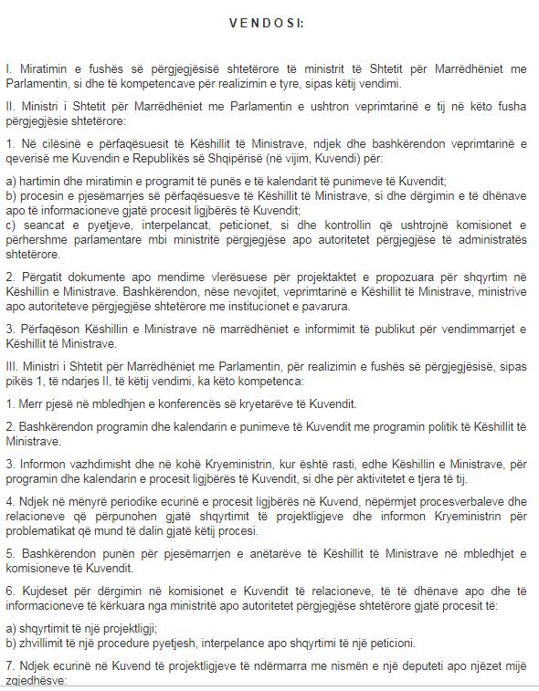 Pas emërimit në postin e ministres së Shtetit për Marrëdhëniet me Parlamentin, qeveria ka përcaktuar me anë të një VKM-je edhe kompetencat. Ministrja Elisa Spiropali përfaqëson qeverinë dhe bashkërendon veprimtarinë e qeverisë me Kuvendin e Republikës së Shqipërisë, si për hartimin e programit të punës dhe kalendarit të punimeve të Kuvendit. Ministrja në fjalë merr pjesë në mbledhjen e konferencës së kryetarëve të Kuvendit, bashkërendon programin dhe kalendarin e punimeve të Kuvendit me programin politik të Këshillit të Ministrave si dhe informon kryeministrin për programin dhe kalendarin e procesit ligjbërës të Kuvendit.