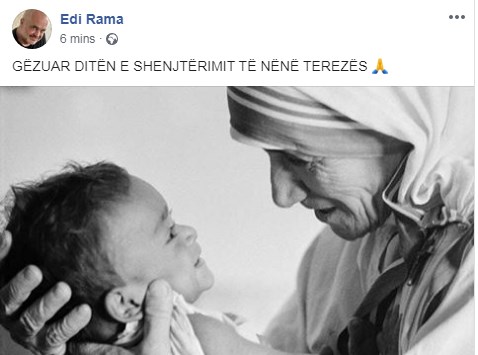 Përmes një postimi në rrjetet sociale kryeministri Edi Rama ka përshëndetur 3 vjetorin e shenjtërimit të Nënë Terezës.
