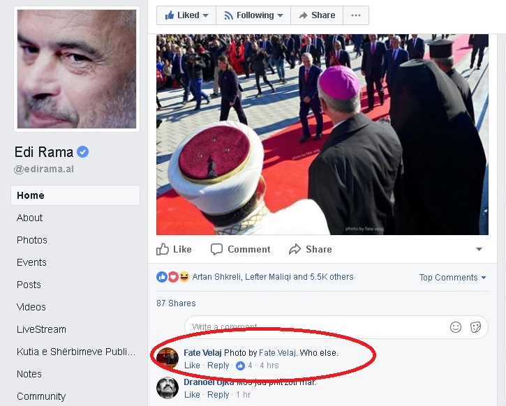 Pas festës kryeministri Rama, i dalluar në përzgjedhjet e FOTO E DITES, ka postuar në profilin e tij në Facebook foton, e cila është realizuar nga deputeti socialist Fate Velaj.