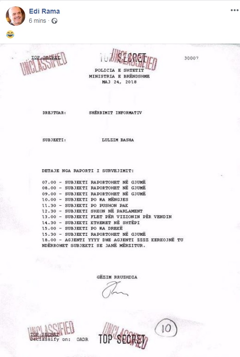 Kryeministri Edi Rama ka postuar në Facebook, ‘shënimet’ e policisë që survejon kreun e Partisë Demokratike Lulzim Basha.