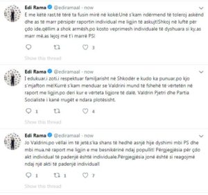 “Jo Valdrini,po vëllai im të jetë,s’ka shans të hedhë asnjë hije dyshimi mbi PS dhe mbi mua,në raport me ligjin e me besnikërinë ndaj popullit! Përgjegjësia për çdo akt individual të padenjë është individuale.Përgjegjësia jonë është si reagojmë ndaj një akti të padenjë individual! I edukuar,i zoti,i respektuar familjarisht në Shkodër e kudo ka punuar,po kjo s’mjafton më!Kurrë s’kam menduar se Valdrini mund të fshehë të vërtetën në raport me ligjin,po deri kur e vërteta ligjore të dalë, Valdrin Pjetri dhe Partia Socialiste i kanë rrugët e ndara plotësisht. E me këtë rast,të tërë ta fusin mirë në kokë:Unë s’kam ndërmend të toleroj askënd dhe as të marr përsipër raportin individual me ligjin të askujt!Shkoj në luftë për çdo ide,qëllim a shok armësh,po kosto veprimesh individuale të dyshuara si ky,as marr më,as lejoj më t’i marrë PS”, shkruan Rama. /l.m