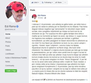 Kryeministri Edi Rama ka publikuar në rrjetin social Facebook një mesazh që i ka ardhur në celular lidhur me shërbimet e ofruara nga “Air Albania”.