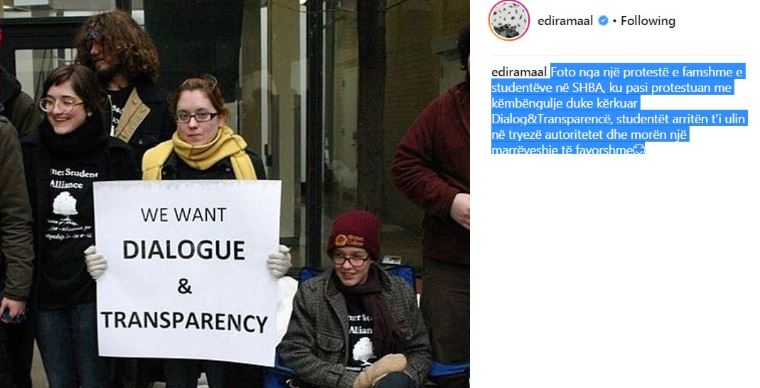“Foto nga një protestë e famshme e studentëve në SHBA, ku pasi protestuan me këmbëngulje duke kërkuar Dialog&Transparencë, studentët arritën t’i ulin në tryezë autoritetet dhe morën një marrëveshje të favorshme.”-shkruan Rama.