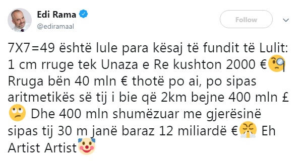 7X7=49 është lule para kësaj të fundit të Lulit: 1 cm rruge tek Unaza e Re kushton 2000 €. Rruga bën 40 mln € thotë po ai, po sipas aritmetikës së tij i bie që 2km bejne 400 mln £. Dhe 400 mln shumëzuar me gjerësinë sipas tij 30 m janë baraz 12 miliardë €.