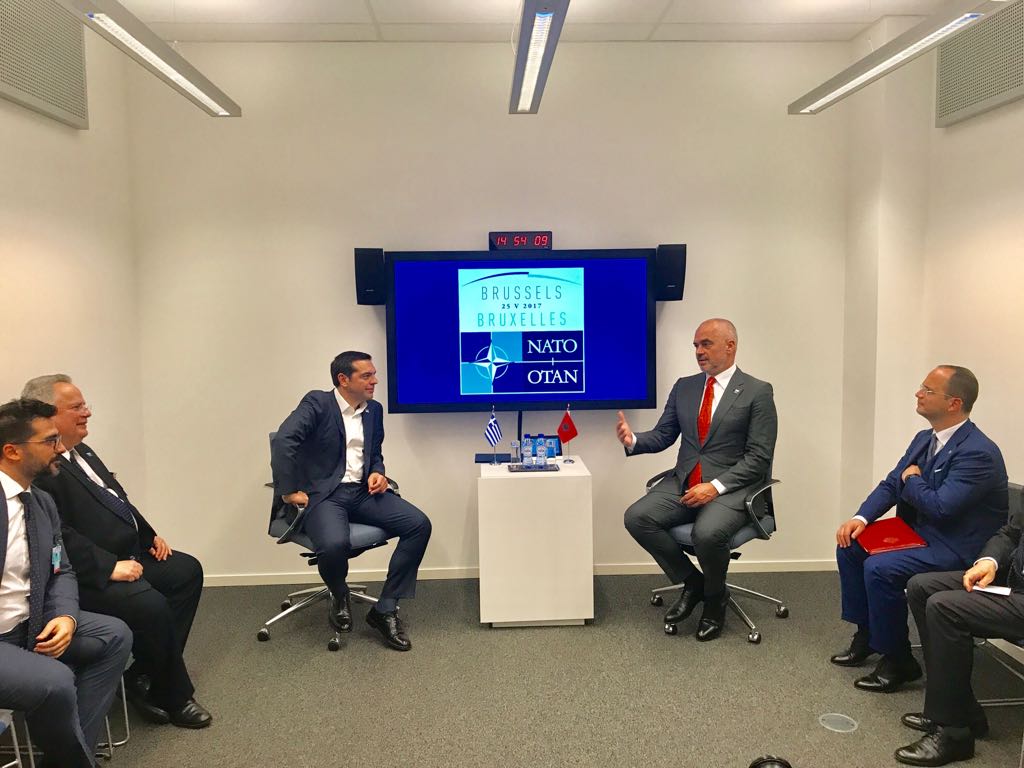 Në kuadër të Samitit të NATO-s në Bruksel, Kryeministri Edi Rama pati një takim me homologun grek Alexis Tsipras. Në takim morën pjesë dhe dy Ministrat e Jashtëm Bushati dhe Kotzias. Dy Kryeministrat nënvizuan natyrën dhe rëndësinë strategjike të marrëdhënieve shqiptaro-greke dhe rolin e miqësisë mes të dy popujve si urë paqeje e stabiliteti ne mbarëvajtjen e integrimit euro-atlantik të rajonit.