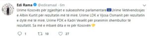 Kryeministri Edi Rama uron Kosovën për mbajtjen e zgjedhjeve parlamentare, teksa numërimi i votave është drejt fundit, ndërsa rezultati është bërë i ditur.