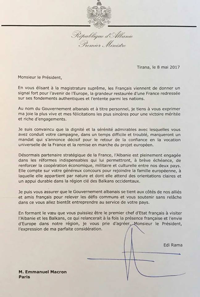 Duke ju zgjedhur në detyrën e lartë, populli francez i dha një sinjal të mirëpritur të ardhmes së Europës, rimëkëmbjes së një France të ripërtërirë mbi vlerat e saj më autentike dhe mirëkuptimit mes kombeve. Në emër të Qeverisë shqiptare dhe në emrin tim personal, dëshiroj t’ju shpreh gëzimin e thellë dhe urimet më të sinqerta për fitoren tuaj të merituar dhe angazhuese.