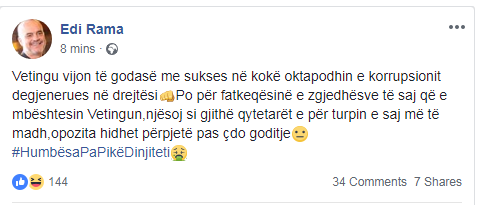 Ish kryeministri Sali Berisha postoi sot nje koment ne te cilin akuzonte kryeministrin Edi Rama se po udheheq procesin e vetingut. Por Rama i eshte kunderpergjigjur me nje postim te shkurter ne FB, ku shkruan se “opozita hidhet përpjetë pas çdo goditje”.