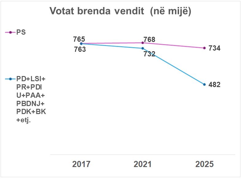 Qysh prej 2017-ës, PS-ja në pushtet ka garuar e vetme në zgjedhjet parlamentare, përballë disa partive kryesore opozitare (PD, LSI, PR, PDIU, PAA, PBDNJ, PDK, BK etj). Duke mbledhur votat e partive kryesore opozitare, konstatohet se epërsia e PS-së ndaj tyre si grup ishte modeste më 2017 dhe më 2021, por PS-ja siguroi plot 74 mandate parlamentare në të dyja zgjedhjet falë përthyerjeve të sistemit tonë elektoral rajonal.