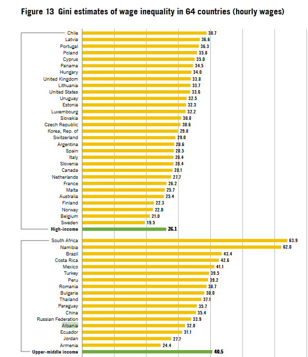 Vendet me nivelet më të ulëta të pabarazisë në paga gjenden në grupin me të ardhura të larta, ndërsa vendet me nivelet më të larta të pabarazisë në paga gjenden në grupet me të ardhura të ulëta dhe me të ardhura mesatare. Ka gjithashtu disa ndryshime brenda grupimeve: midis vendeve me të ardhura të larta, koeficienti i Gini varion nga një nivel i ulët prej 19.5 për Suedinë në një nivel të lartë prej 38.7 për Kili. Midis vendeve me të ardhura të ulëta, Republika e Bashkuar e Tanzanisë ka një koeficient Gini prej 53.6, ndërsa Afrika e Jugut – e klasifikuar si të ardhura të mesme dhe të mesme – ka një koeficient Gini prej 63.9. Sipas këtyre vlerësimeve, Afrika e Jugut, Namibia, Republika e Bashkuar e Tanzanisë dhe Malaëi janë vendet me nivelet më të larta të pabarazisë në paga midis 64 vendeve të konsideruara.