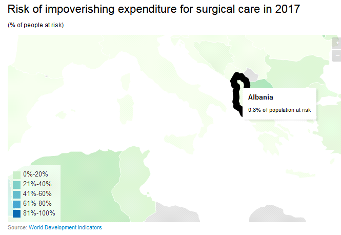 Për Shqipërinë, shifrat sugjerojnë se kemi të bëjmë me 0.8% të popullsisë që nuk kanë qasje në shërbime kirurgjike për arsye financiare, gjë që mund të rezultojë në pasoja fatale për popullatën. Në Ballkan, panorama duket e ngjashme. Në Serbi, 0.5% e popullsisë nuk arrijnë të përballojnë një kujdes kirurgjik për shkak të kostove të larta. Po ashtu, 0.8% e popullsisë në Malin e Zi, nuk arrin që të përballojë këtë kujdes shëndetësor. Shifra më e lartë regjistrohet në Maqedoni, ku BB përllogarit rreth 7.9% të popullsisë në vështirësi financiare për të përballuar një ndërhyrje kirurgjike.
