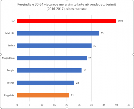 Në vitin 2016 vetëm 21 % 30 vjeçarëve shqiptare kishin arsim të lartë, teksa në Malin e Zi ishin 33%, në Serbi 30%, Maqedoni, 38%, Turqi 26%, Bosnjë 23%.