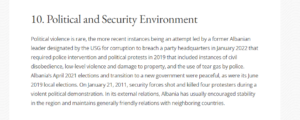 Zgjedhjet në Shqipëri të prillit 2021 dhe kalimi në një qeveri të re ishin paqësore, ashtu si edhe zgjedhjet lokale të qershorit 2019. Më 21 janar 2011, forcat e sigurisë qëlluan dhe vranë katër protestues gjatë një demonstrate të dhunshme politike. Në marrëdhëniet e saj të jashtme, Shqipëria zakonisht ka inkurajuar stabilitetin në rajon dhe ruan marrëdhënie përgjithësisht miqësore me vendet fqinje”, shkruhet ndër të tjera në raport.