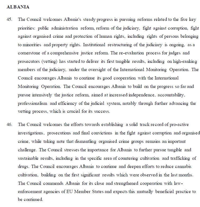 Këshilli nënvizon se Shqipëria duhet të intensifikojë përpjekjet e saj në të gjitha këto fusha dhe duhet të sigurojë se rezultatet e mëtejshme duhet të arrihen edhe në luftën kundër korrupsionit në nivel të lartë, si dhe në çmontimin e rrjeteve kriminale të organizuara.