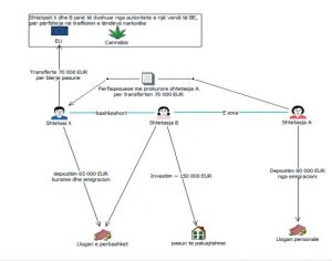 -shtetasja B ka investuar në pasuri të paluajtshme në vlerën prej 150,000 EUR; nuk kanë biznes të regjistruar në QKB. Në lidhje me shtetasin X kemi kërkuar informacion në organet e zbatimit të ligjit dhe në vijim jemi informuar se shtetasit X dhe B janë të dyshuar nga autoritete e një vendi të BE, vendi M si persona të përfshirë në trafikimin e lëndëve narkotike.