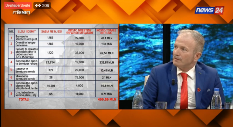 Gazetari i ekonomisë, Fatos Çoçoli foli në “Real Story” të gazetarit Sokol Balla në lidhje me pasojat ekonomike që shkaktoi tërmeti i 26 nëntorit. Çoçoli bëri një bilanc të kostove financiare që Shqipëria do të duhet të përballojë për rindërtimin pas tërmetit. Sipas llogarive të tij, kostoja paraprake shkon në rreth 500 milionë euro.