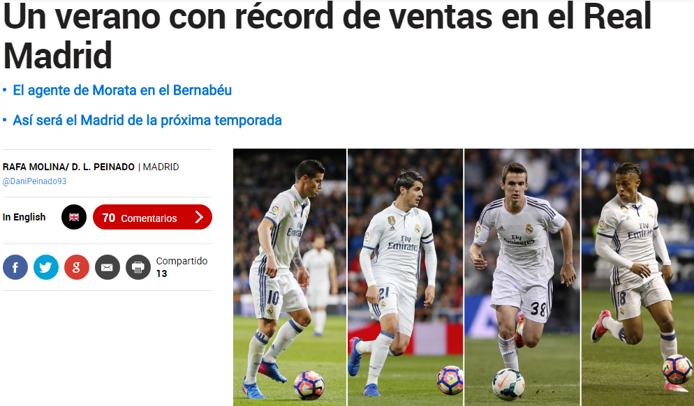 Real Madrid do të thyej rekordin e klubit për më së shumti përfitime nga shitjet brenda një afati kalimtar. Gjatë kësaj vere është e sigurt se nga Real Madridi do të largohen gjashtë lojtarë, Fabio Coentrao, Pepe, Diego Llorente, Mariano Diaz, James Rodriguez dhe Alvaro Morata.