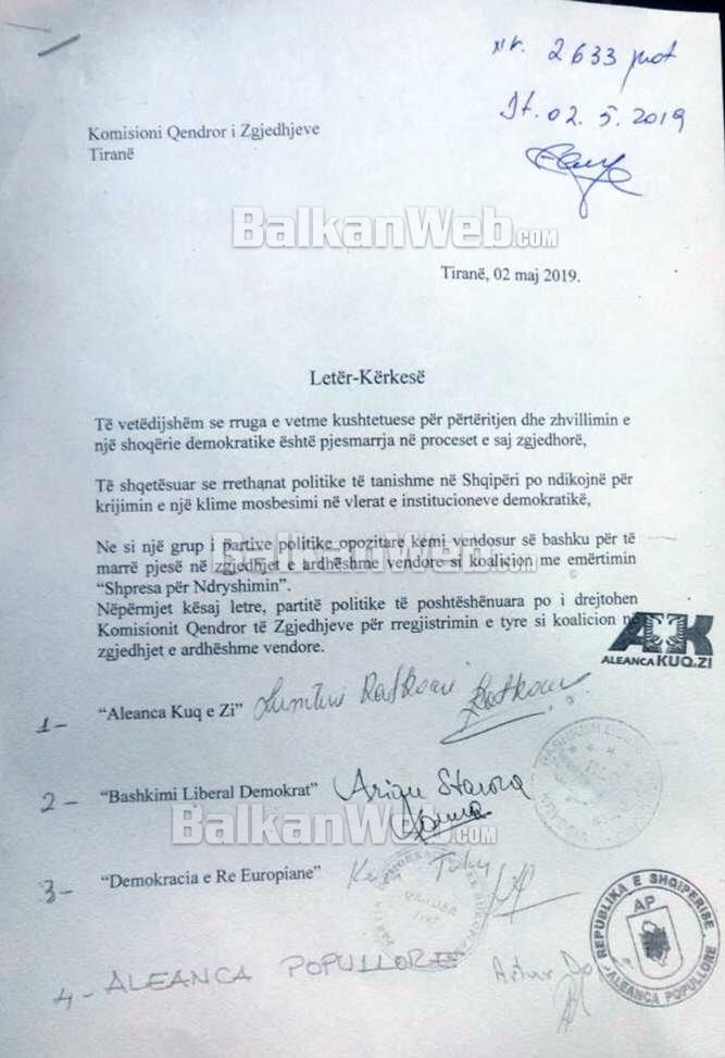 Nëpërmjet kësaj letre, partitë politike të poshtëshënuara po i drejtohen Komisionit Qendror të Zgjedhjeve për regjistrimin e tyre si koalicion në zgjedhjet e ardhshme vendore” thuhet në kërkesën e partive, disa prej tyre ish-aleate të PD.