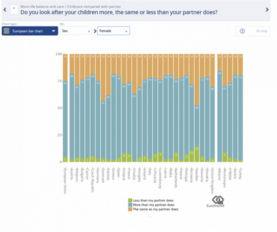 Pyetjes “A kujdeseni për fëmijët më shumë, më pak apo as sa partneri juaj?” në Anketën e Cilësisë së Jetës nga Komisioni Europian, 84% e grave të pyetura janë përgjigjur se kujdesen më shumë dhe vetëm 15% janë përgjigjur se kujdesen po aq sa bashkëshorti. Kjo është përqindja më e lartë e regjistruar në të gjithë vendet anëtare të Bashkimit Europian dhe kandidatët për t’u anëtarësuar.