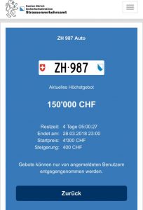Ankandi duket se është përkufizuar në disa ofertues. Ofertuesit me nofkën “kaj” dhe “Vehgim Murati” janë duke garuar në çdo moment për të blerë autotargën “ZH 987”. Por, mbrëmjen e së dielës, ofertuesi “VBerger” i ka tejkaluar të gjithë duke ofruar shumë prej 150’800 frangave, shkruan Albinfo.ch.