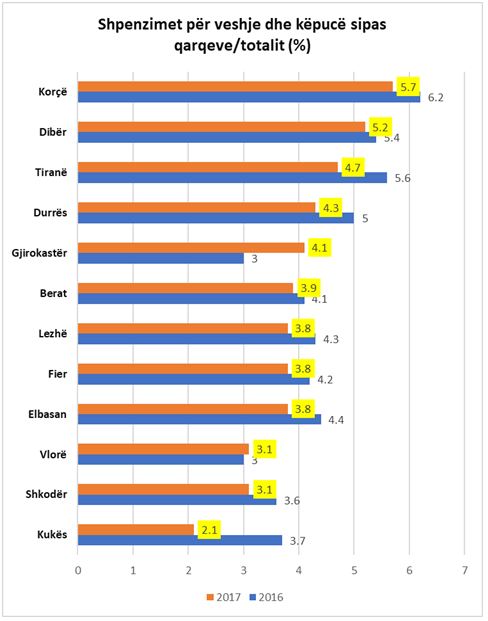 Korçarët kryesojnë listën për sa i përket shpenzimeve për veshje dhe këpucë, sipas të dhënave të publikuara nga Instituti i Statistikave në Anketën e Buxhetit të Familjeve 2017. Në vitin 2017 banorët e qarkut Korçë shpenzuan për veshje dhe këpucë 5.7% të totalit të të gjithë shpenzimeve. Megjithatë, në krahasim me një vit më parë ku shpenzimet llogariteshin 6.2%, ato ranë. Të dytët për shpenzimet më të larta për veshje dhe këpucë janë dibranët. Të dhënat nga INSTAT tregojnë se shpenzimet për veshje dhe këpucë në 2017-n llogariteshin 5.2%, nga 5.4% që ishin një vit më parë. Edhe për qarkun e Dibrës shpenzimet për veshje dhe këpucë ranë në krahasim me një vit më parë.