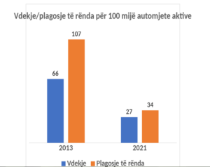 Po a është rritur edhe numri i vdekjeve/plagosjeve të rënda nga aksidentet rrugore gjatë së njëjtës periudhë? Prëkundrazi, është ulur! Kështu, numri i vdekjeve është ulur me 33% (nga 295 më 2013, në 197 më 2021), ndërsa numri i plagosjeve të rënda pothuaj është përgjysmuar (nga 478 më 2013, në 250 më 2021 – shihni grafikun shoqërues).