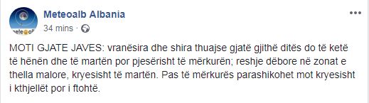 Sipas Meteoalb, vranësira dhe shira thuajse gjatë gjithë ditës do të ketë të hënën dhe të martën, por pjesërisht të mërkurën. Ndërkohë reshje dëbore në zonat e thella malore priten kryesisht të martën.