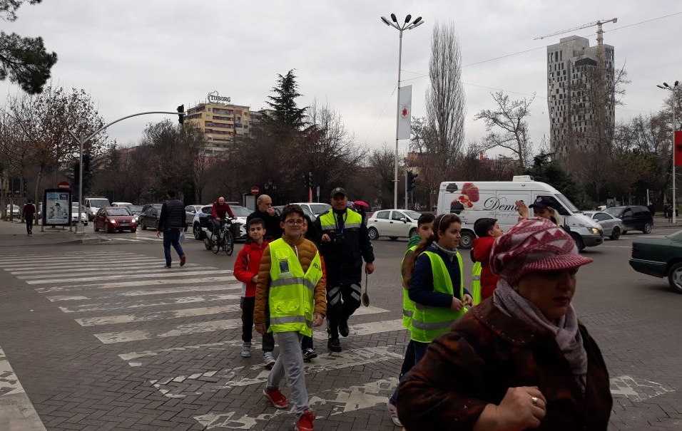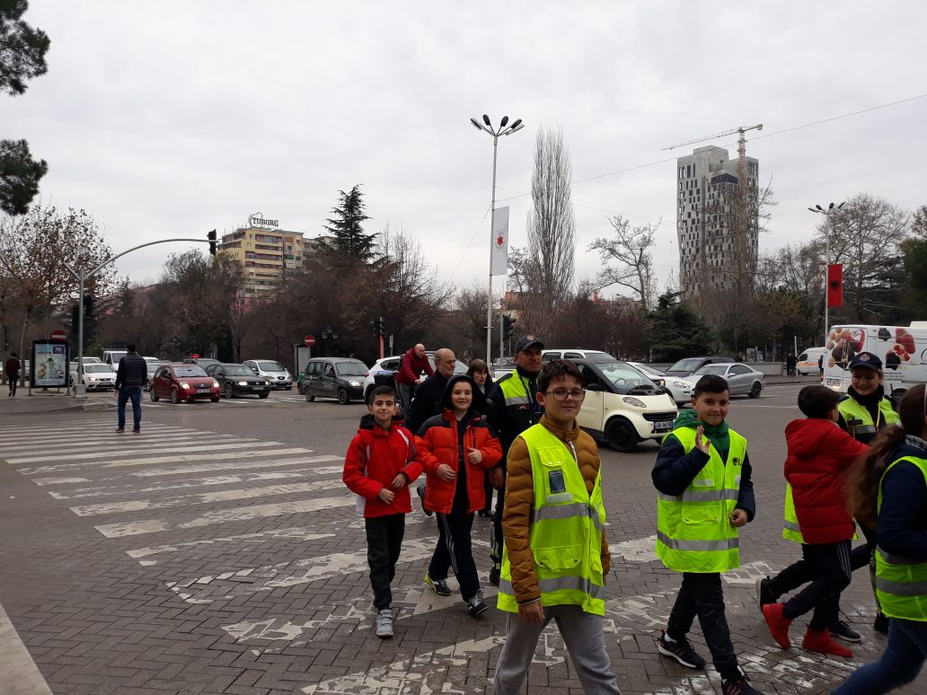 Gjatë ditës së sotme dhjetëra fëmijë të veshur me jelek të verdhe dhe Polic Rrugor kanë ndihmuar edhe të moshuarit për të kaluar vijat e bardha.