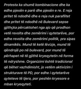 Ky mesazh i brendshëm i drejtuesit të lartë të PD-së del në dritë në një kohë kur, paralelisht me zhvillimin e protestës pranë Kryeministrisë, në terren është konstatuar prania e një grupi që në rrjetet sociale vetëidentifikohet si “Shqiponjat e Reja”. Ky grup, pas përfundimit të fjalimit të Sali Berishës, ka ndërmarrë akte dhune duke hedhur mjete molotov në drejtim të godinës së Kryeministrisë, duke e tensionuar më tej situatën.