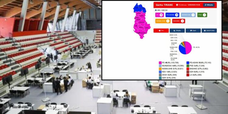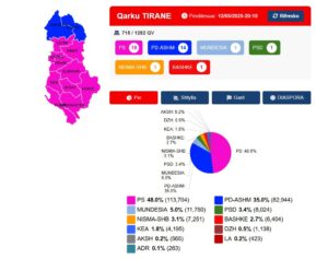 Në Qarkun e Tiranës janë numëruar 704 kuti nga 1282 që janë në total, ku sipas të dhënave, Partia Socialiste kryeson me 110497 vota ose rreth 48.11 %.
