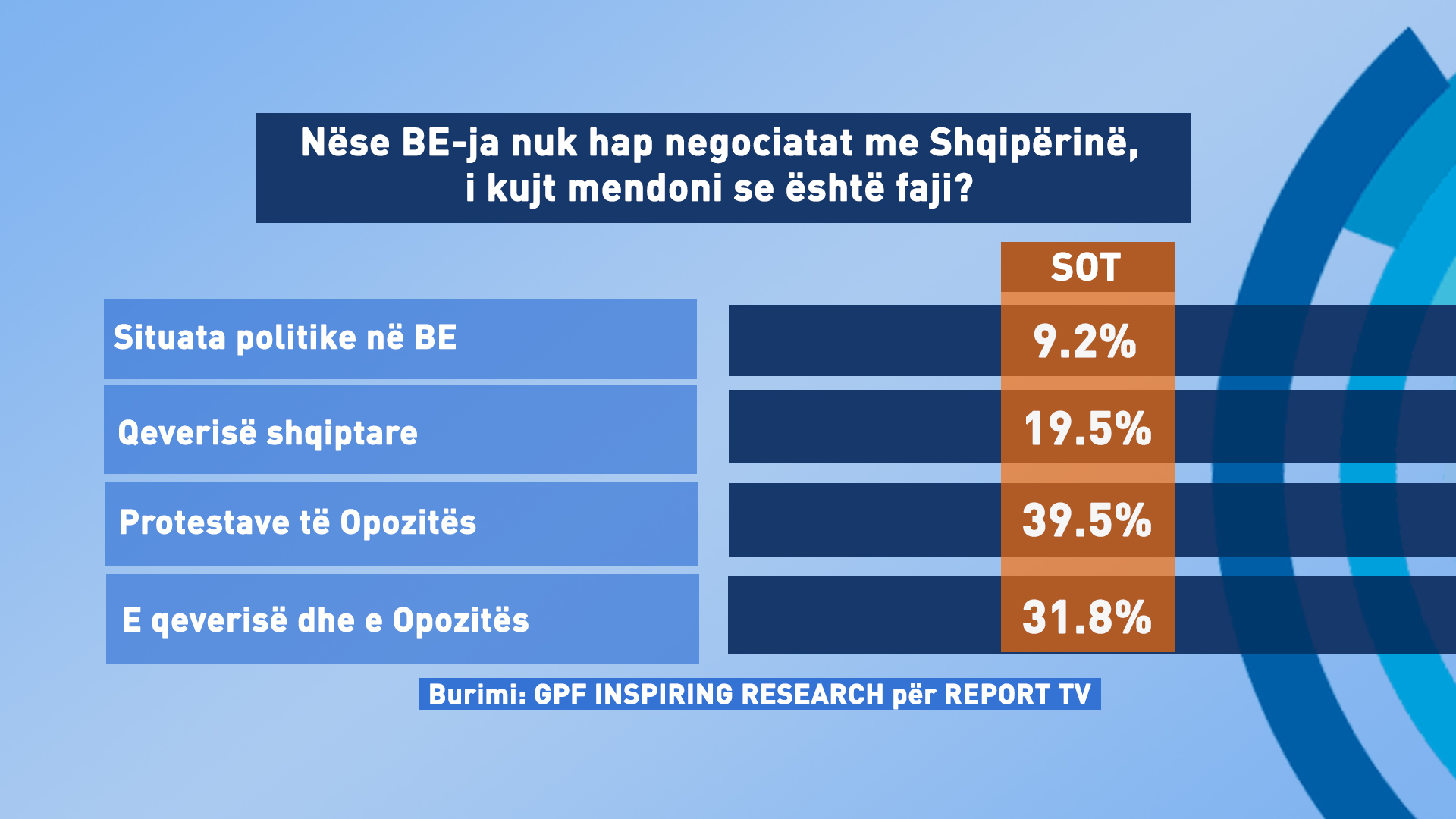 Fajin nëse nuk hapen negociatat këtë vit 39.5% e shqiptarëve të pyetur nga GPF Inspiring Research ia vënë protestave të opozitës ndërsa 31 % e tyre ia vënë klasës politike në përgjithësi përfshirë këtu qeverinë dhe opozitën, duke nënkuptuar mungesën e dialogut mes tyre.