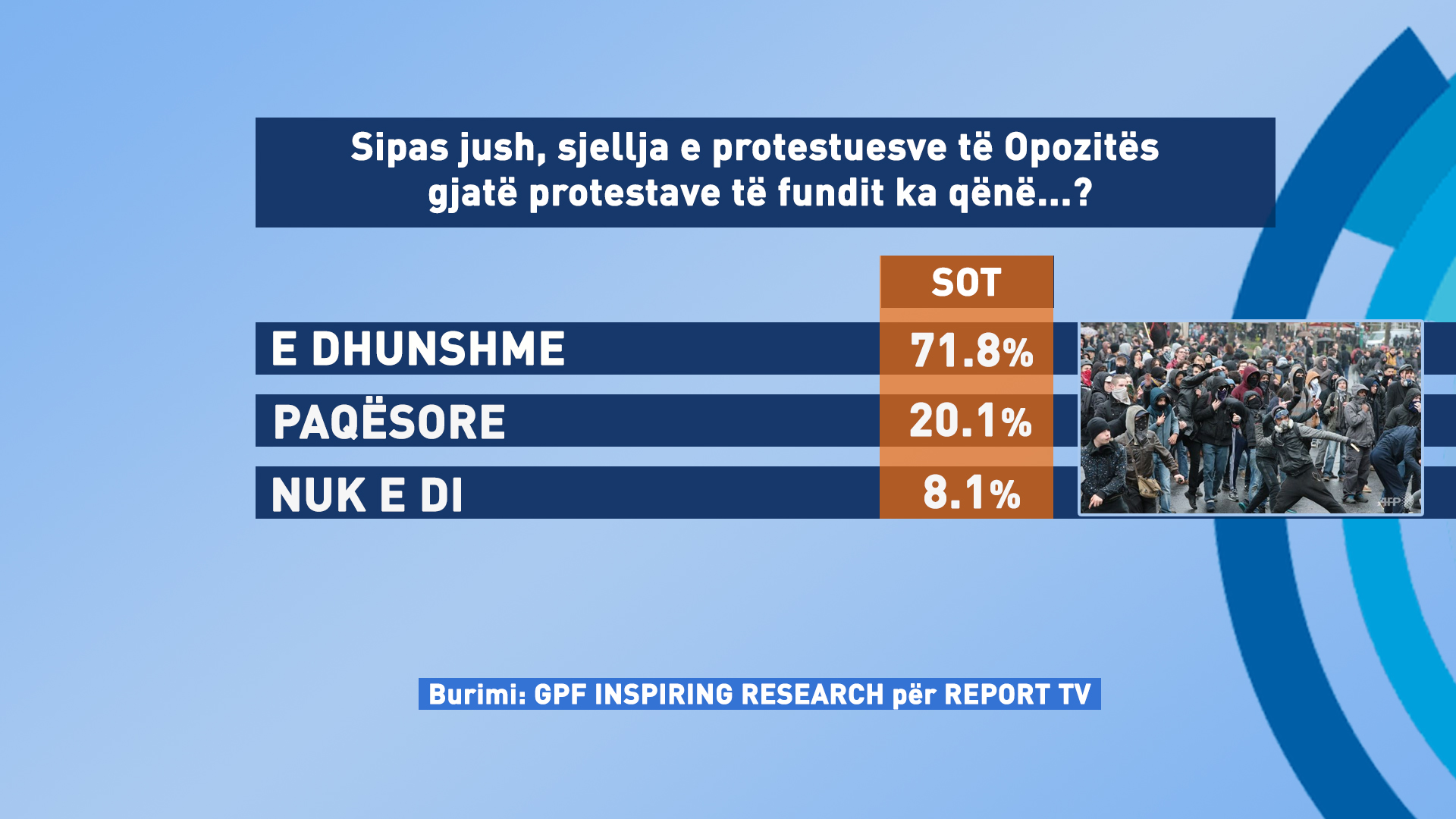 71.8% e shqiptarëve të pyetur nga GPF Inspiring Research thonë se protestat e opozitës kanë qenë të dhunshme ndërsa 20.1% e quajnë atë paqësore.