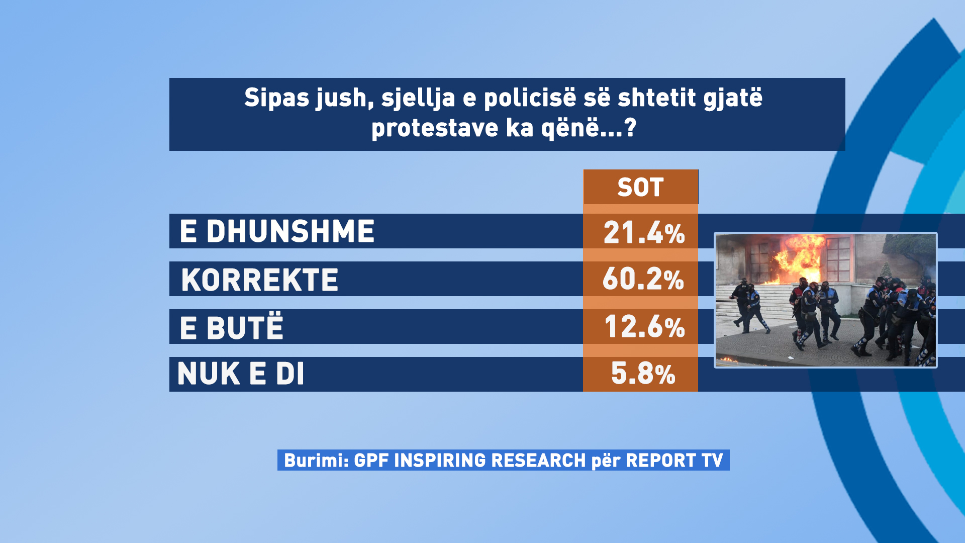 Sjellja e policisë së shtetit gjatë protestave të opozitës sipas shqiptarëve të pyetur nga GPF Inspiring Research, ka qenë korrekte ndërsa për 21.4% thonë se ka qenë e dhunshme.