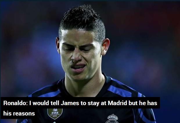 Cristiano Ronaldo, ylli i Real Madridit, i ka bërë thirrje James Rodriguez që mos të largohet nga ‘Santiago Bernabeu’. Ylli i Real Madridit, Cristiano Ronaldo po mundohet që ta bindë James Rodriguez që mos të largohet nga ‘Santiago Bernabeu’.