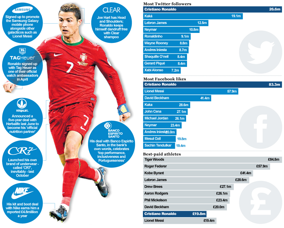 Portugezi ka më shumë se 330 milion ndjekës në mediat sociale- as Lionel Messi e as Neymar nuk i afrohen. Ronaldo gjeneron më shumë se 400 milion euro nga sponsorizimet në reklama, duke bashkuar të ardhurat edhe nga vlerat e tij si lojtar ai fitonte 250 milion euro për sezon, shkruan telesport.