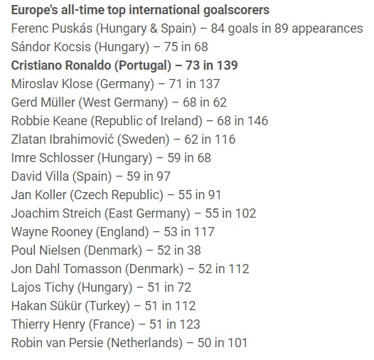 Ronaldo ka kaluar Klosen, i cili ka shënuar 71 gola me Gjermaninë dhe është vënë pas Sandor Kocsis të Hungarisë, që ka shënuar 75 gola për Kombëtaren, derisa golashënuesi më i mirë në histori është Ferenc Puskas (Hungari – Spanjë), i cili ka shënuar 84 gola.