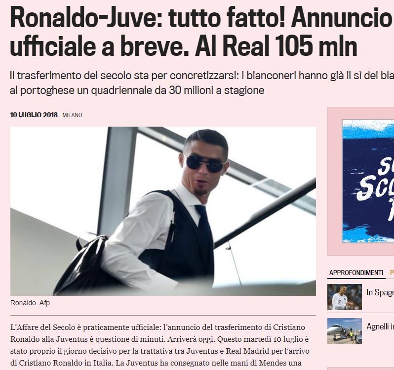 Agjenti i Ronaldos, ka në dorë ofertën e Juventusit për Realin e Madridit: 105 milionë euro e cila do të pranohet nga klubi “mbretëror”. Edhe pse klauzola e largimit të Ronaldos është 1 miliard euro, ai ka një marrëveshje verbale me Florentino Perez që të mund të largohej për 100 milionë euro në një klub që ai do dëshironte, duke përjashtuar Barcelonën, PSG, United dhe City.