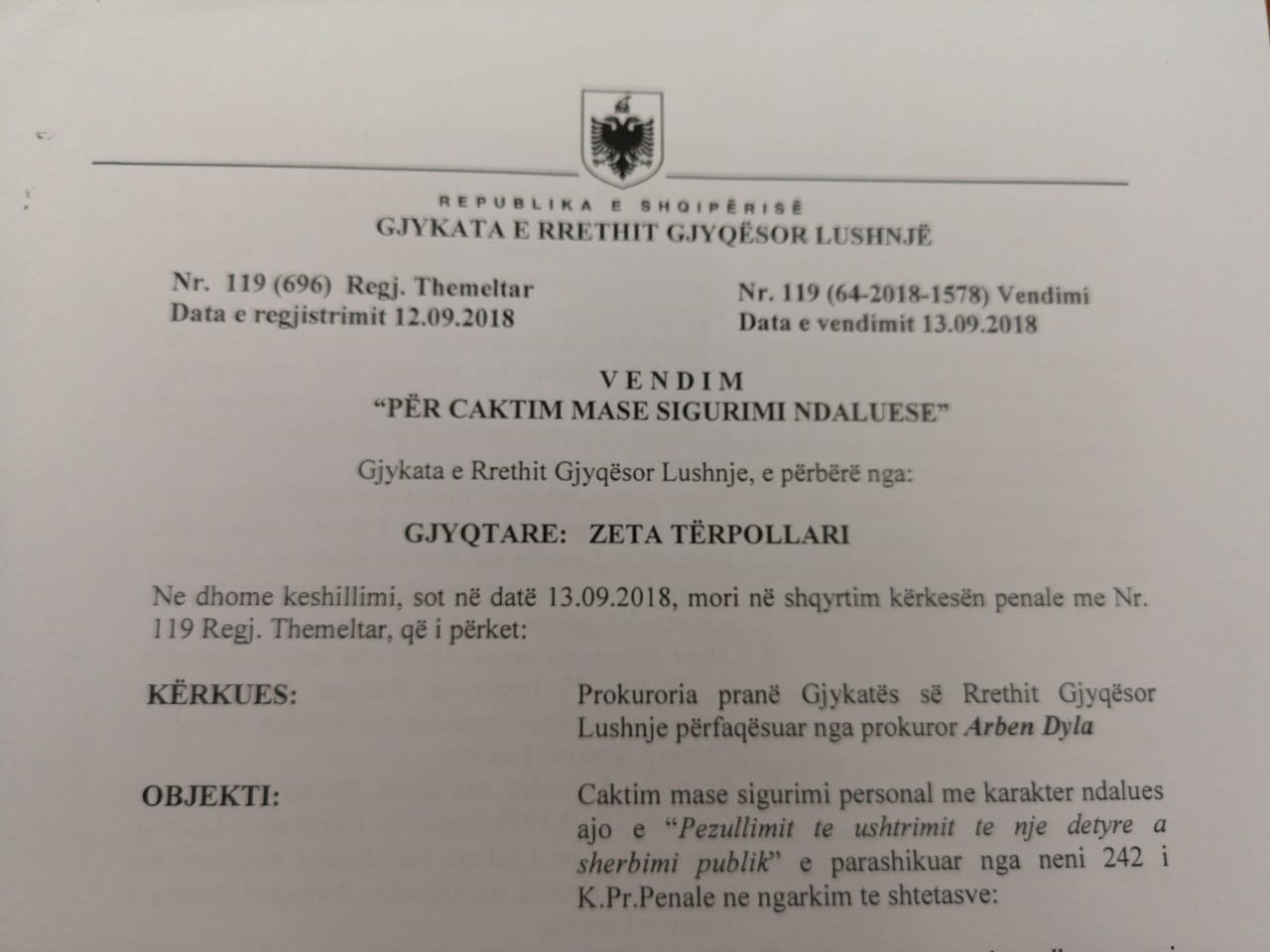 Per ta ka regjistrim si persona nen hetim me akuzat Shperdorim detyre dhe falsifikim i dokumenteve shkollore, mbeshtetur ne nenet 248 e 187 te. K. Penal. Procedimi penal me nr 400 viti 2017. Komunikimi i mases eshte kryer me date 14.09.2018″, raporton policia.