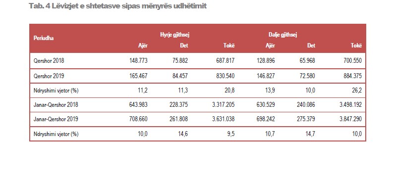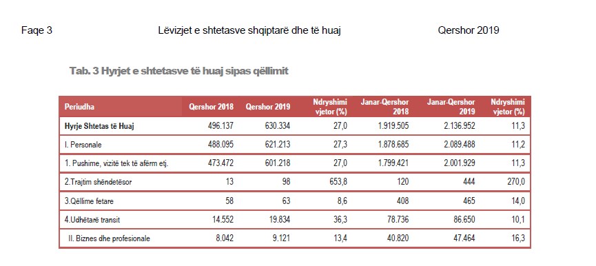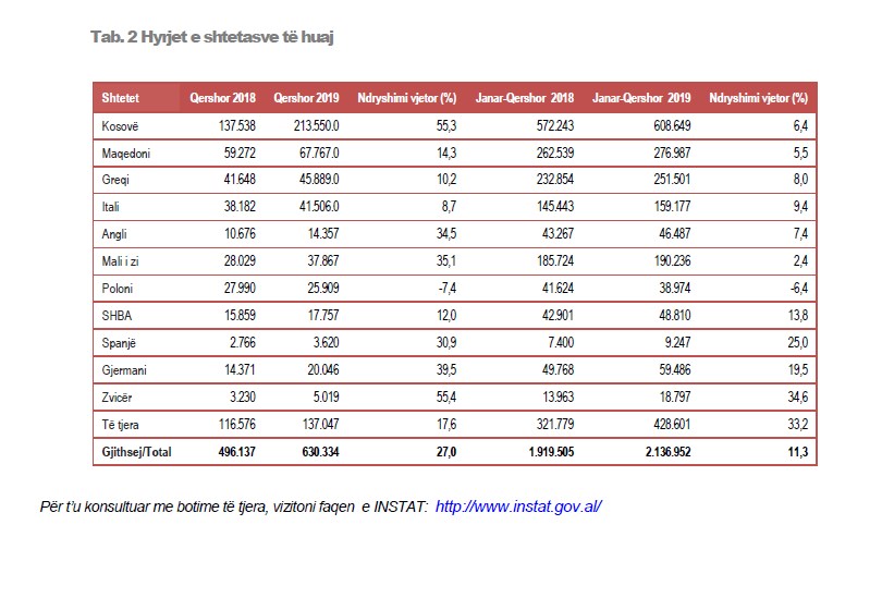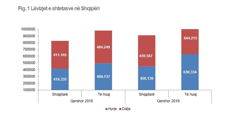 Numri i hyrjeve dhe daljeve të shqiptarëve dhe të huajve në muajin qershor dhe në gjashtëmujorin e parë të 2019-s krahasuar me të njëjtën periudhë të një viti më parë ka pësuar rritje të ndjeshme. Referuar të dhënave nga Instituti i Statistikave (INSTAT) bëhet e ditur se në qershor të 2019 janë regjistruar 1080464 hyrje shqiptarësh dhe të huajsh dhe është rritur me 18,4% krahasuar me qershorin e 2018-s. Në periudhën e qershorit kanë rezultuar të hyjnë 630334 dhe është rritur me 27% në krahasim me qershorin e 2018-s.
