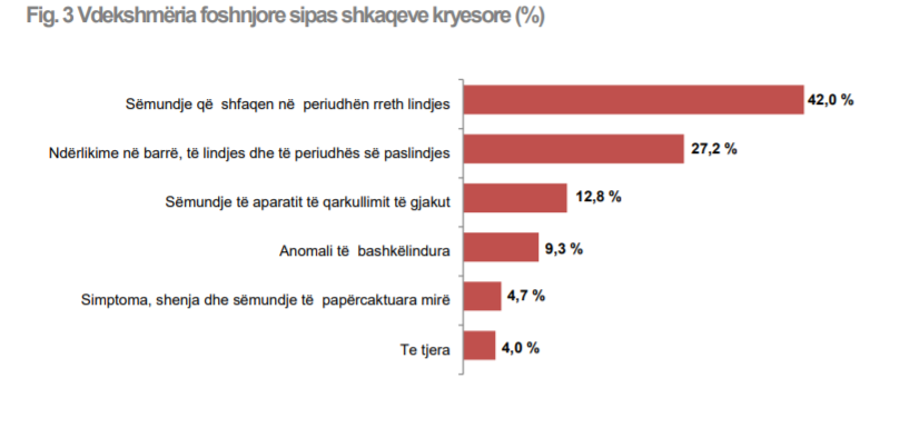 Më tej INSTAT raporton se shkaqet kryesore të vdekshmërisë foshnjore (nën 1 vjeç) janë “sëmundjet që shfaqen në periudhën e rreth lindjes” me 42,0 % dhe “ndërlikime në barrë të lindjes dhe të periudhës së paslindjes” me 27,2 % të kësaj grupmoshe gjithsej.