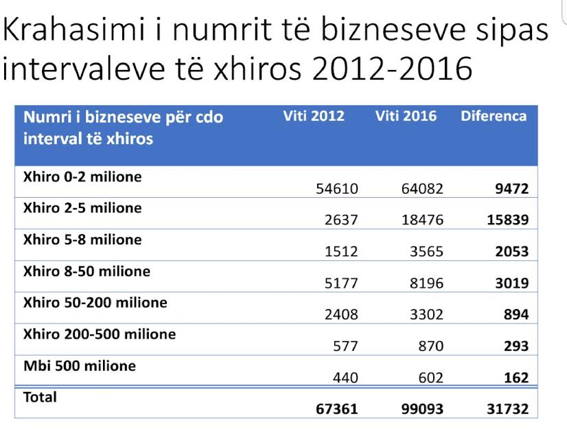 Krahasimi i të dhënave zyrtare të publikuara nga Tatimet, tregojnë se në periudhën 2012-2016 ka pasur rritje të çdo kategorie biznesi në vend. Megjithatë, kategoria me më shumë rritje është ajo e biznesit të mesëm, shtresë e ndikuar veçanërisht nga operacioni anti-informalitet, që detyroi bizneset të deklaronin xhirot e tyre të vërteta. Numri i bizneseve të mesme në katër vjet është 7-fishuar.