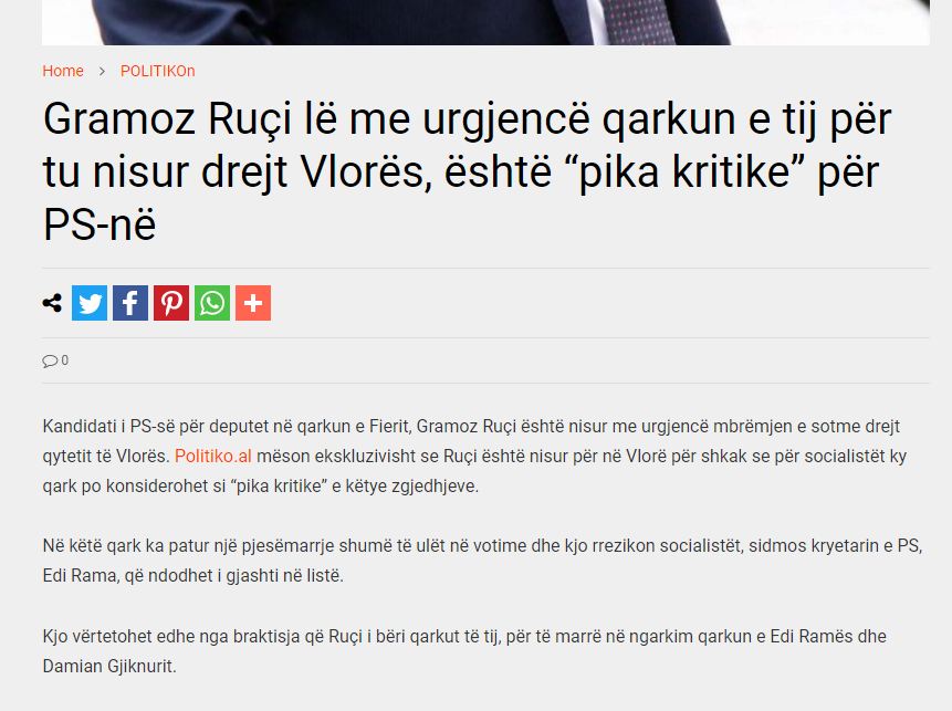 Portali Politiko.al shkruan sot se Gramoz Ruçi është nisur urgjencë drejt Vlorës dhe ka lënë qytetin e Fierit, ku ai kandidon. Sipas këtij portali, Ruçi është nisur drejt Vlorës si rezultat i pjesëmarrjes së vogël të votuesve.