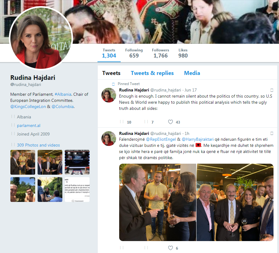 Nje dite pasi deklaroi se nuk ishte lejuar te ishte pjese e ceremonise ne Tropoje, ku presidenti i vendit, Ilir Meta dhe kongresmeni Eliot Engel, vizituan bustin e te atit te saj, Azem Hadarit, deputetja Rudina Hajdari ka ndare nje tjeter mesazh me ndjekesit e saj ne Twitter.