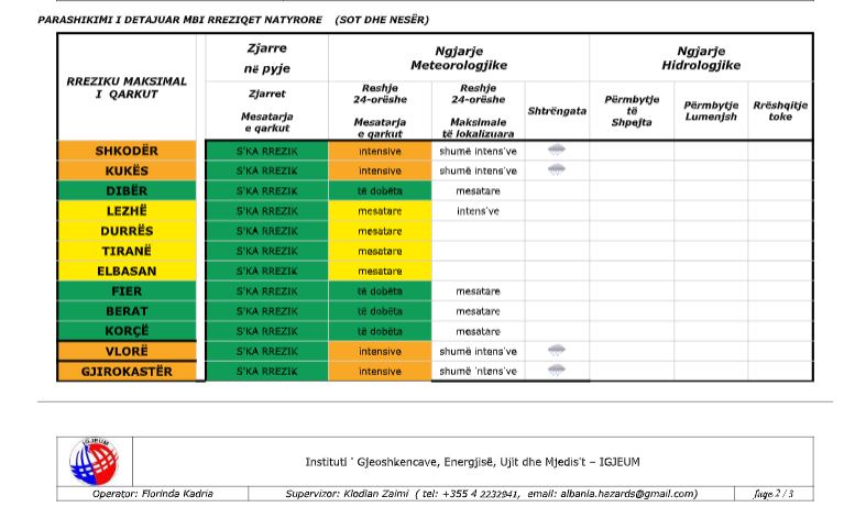 Vendi ynë do të përfshihet nga reshje intensive shiu gjatë ditës së sotme dhe gjatë së hënës. Sipas IGJEUM, në qarqet Lezhë, Durrës, Tiranë, Elbasan priten reshje mesatare, ndërsa në qarqet Shkodër, Kukës, Vlorë dhe Gjirokastër priten reshje intensive të shoqëruara me shtrëngata.