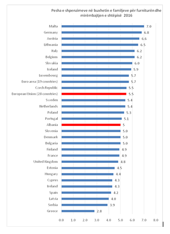 Sipas të dhënave të Eurostat, që referojnë strukturën e shpenzimeve të familjeve në vitin 2016, shihet se ato shpenzojnë mesatarisht për mirëmbajtjen e shtëpisë 5.5% të totalit, teksa në të njëjtën periudhë familjet shqiptare shpenzuan për furniturën e shtëpisë 5.0 për qind te të ardhurave të tyre mujore.